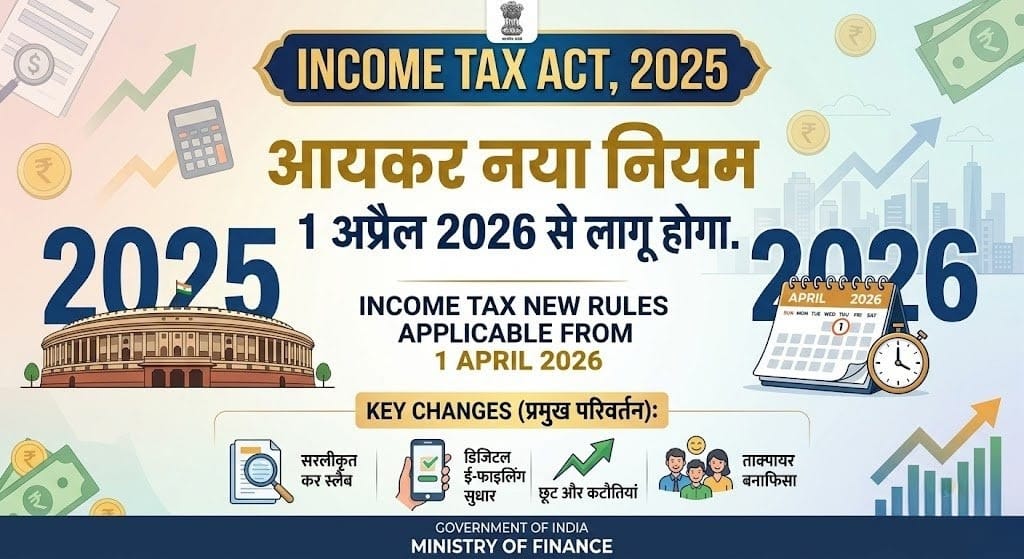New Income Tax Rules 2026 : 1 अप्रैल 2026 से इनकम टैक्स एक्ट 1961 की जगह इनकम टैक्स एक्ट 2025 लागू होगा जो सिस्टम को आसान बनाएगा, व्यवस्था को पारदर्शी करेगा ताकि आम लोगों को टैक्स कानून आसानी से समझ में आए।