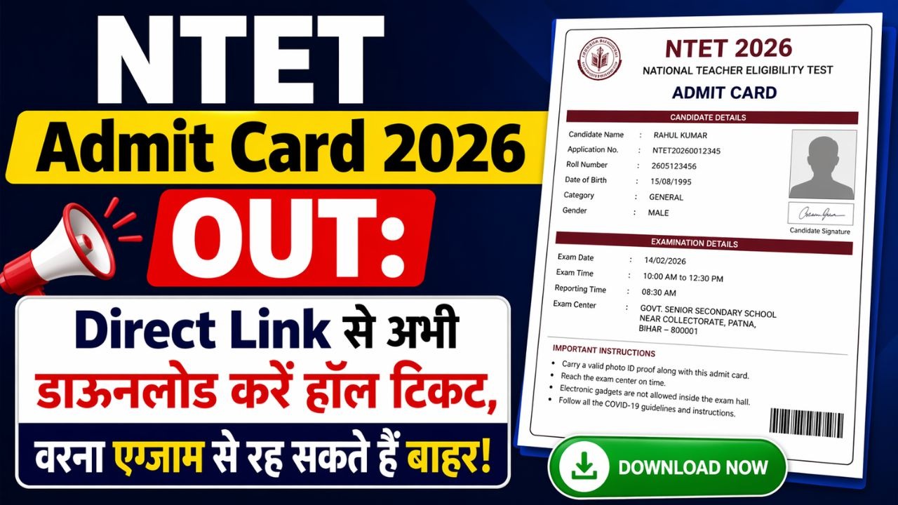 • NTET Admit Card 2026 OUT: Direct Link से अभी डाउनलोड करें हॉल टिकट, वरना एग्जाम से रह सकते हैं बाहर!