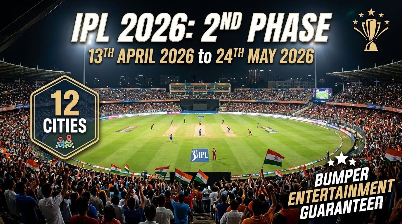 IPL 2026 2nd Phase: क्रिकेट फैंस के लिए बहुत बड़ी खुशखबरी सामने आ रही है। IPL 2026 के सबसे रोमांचक फेज की जानकारी और पूरा शेड्यूल जारी कर दिया गया है। चुनावी वजह से इस बार IPL को 2 अलग-अलग हिस्सों में बांट दिया गया था IPL 2026 फेज 1 और IPL 2026 फेज 2। फेस 1 का शेड्यूल पहले ही जारी किया जा चुका था और अब IPL 2026 2nd Phase का शेड्यूल भी सामने आ गया है। लगातार 12 शहरों में यह दूसरा चरण डबल हेडर मुकाबले के साथ खेला जाएगा जिसमें बहुत सारा रोमांच और बहुत सारा क्रिकेट देखने को मिलेगा।