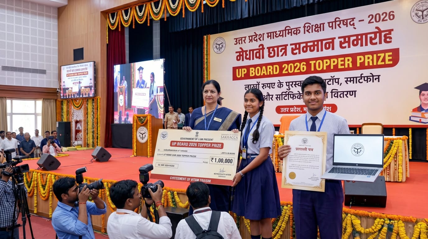 Up board 2026 परिणाम आने के बाद उत्तर प्रदेश सरकार 10 वीं और 12वीं के टॉपर्स को आकर्षक पुरस्कार देती है। पिछले वर्ष के पैटर्न को ध्यान में रखते हुए स्पष्ट कर दें कि सरकार राज्य स्तर के टॉपर्स को लगभग ₹100000 का कैश प्राइज, एक लैपटॉप या टैबलेट और सम्मान पत्र देती है।